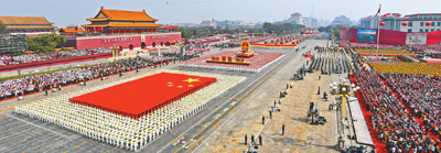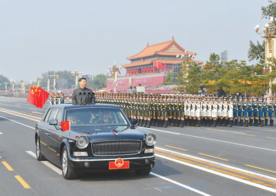 雄壮的军乐声中,习近平乘车沿着宽阔的长安街,依次检阅15个徒步方队、32个装备方队。近15000名受阅官兵整齐列阵、英姿勃发,580台受阅装备在阳光下熠熠生辉。这是中国特色社会主义进入新时代的首次国庆阅兵,也是共和国武装力量改革重塑后的首次整体亮相。