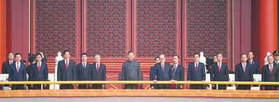 10月1日,庆祝中华人民共和国成立70周年大会在北京天安门广场隆重举行。这是中共中央总书记、国家主席、中央军委主席习近平等在天安门城楼上。新华社记者 燕 雁摄